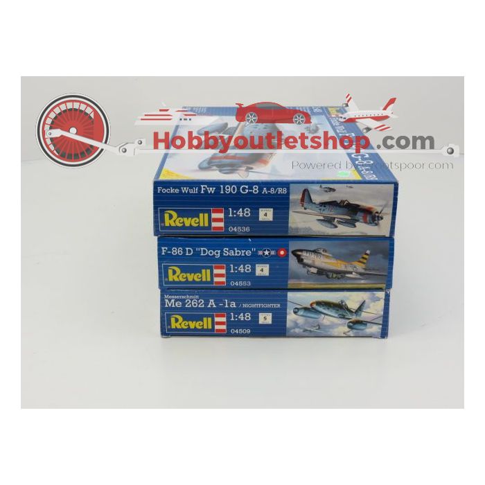 Schaal 1:48 REVELL Set of 3 ME 262A-1A Nightfighter, F-86D ''Dog Sabre'', Focke Wulf FW 190 G-8 A-8/R8 Art. Nrs. 04509 / 04533 / 04536 #145 is available to buy in increments of 1