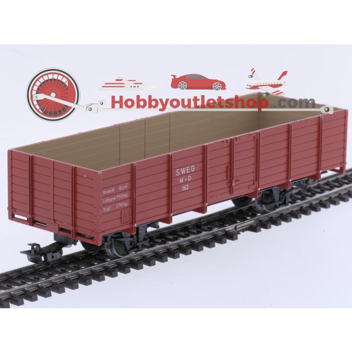 EN: Scale 0e Märklin 4450 open freight wagon of SWEG, running number M-D 162. Model in used condition with visible signs of wear on the body. Plastic wagon with open load area, featuring markings such as “Bodenfl. 16m²” and load capacity details. Equipped with metal wheelsets and standard Märklin couplers. Supplied in original packaging showing noticeable wear and damage.