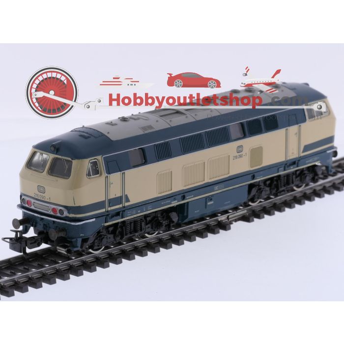 This model represents a Märklin diesel locomotive of the BR 216 series in the classic beige/blue DB livery as visible on the model. The printed markings and running number 216 090-1 are clearly applied on the sides and front. The model is equipped with two bogies and Märklin couplers on both ends. Construction and detailing reflect typical characteristics of Märklin models from this series. The locomotive is used but remains visually in very good condition with minor signs of use. The underside and drive components appear complete. Delivered without original packaging.