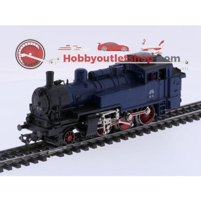 This model represents a Märklin tank steam locomotive of the BR 74 series in a dark livery with red wheels and metal driving rods, as visible on the model. The marking “Nr. 34” is applied on the front and cab sides. The locomotive features an integrated coal bunker with visible coal load. Märklin couplers are present on both ends and are bent. The underside and drive components appear complete. The locomotive is used and in good condition with visible signs of use. Supplied without original packaging.