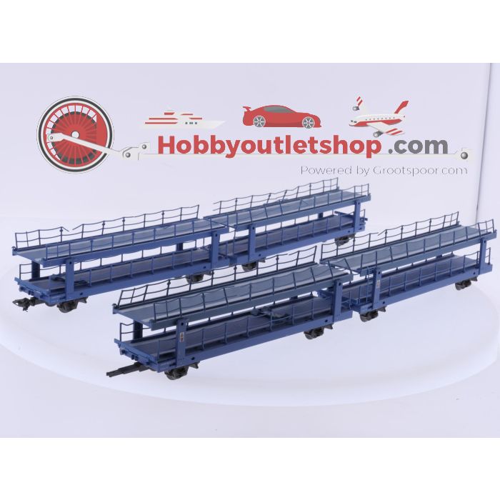 Set of four car carrier wagons by Märklin in H0 scale, type Leks 555 of Deutsche Bahn. The wagons are finished in a blue livery with detailed side railings and double loading decks for vehicle transport. Each wagon is equipped with two bogies and Märklin couplers, suitable for 3-rail AC systems. The open construction with loading platforms and railings is finely reproduced. The models represent Epoch V and feature markings consistent with modern DB car transport wagons. The set is intended for transporting passenger cars and complements realistic freight trains. Undercarriage and detailing, including brake and structural elements, are visibly modelled.