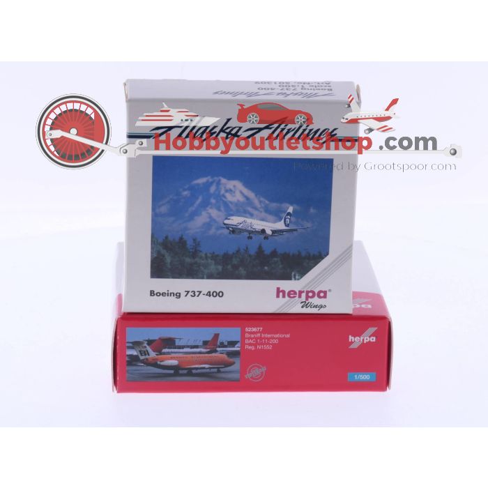 Schaal 1:500 Herpa 501309 Boeing 737-400 en Herpa 523677 Braniff International BAC 1-11-200 "Jelly Bean Orange" #4636 is beschikbaar om te kopen in verhogingen van 1