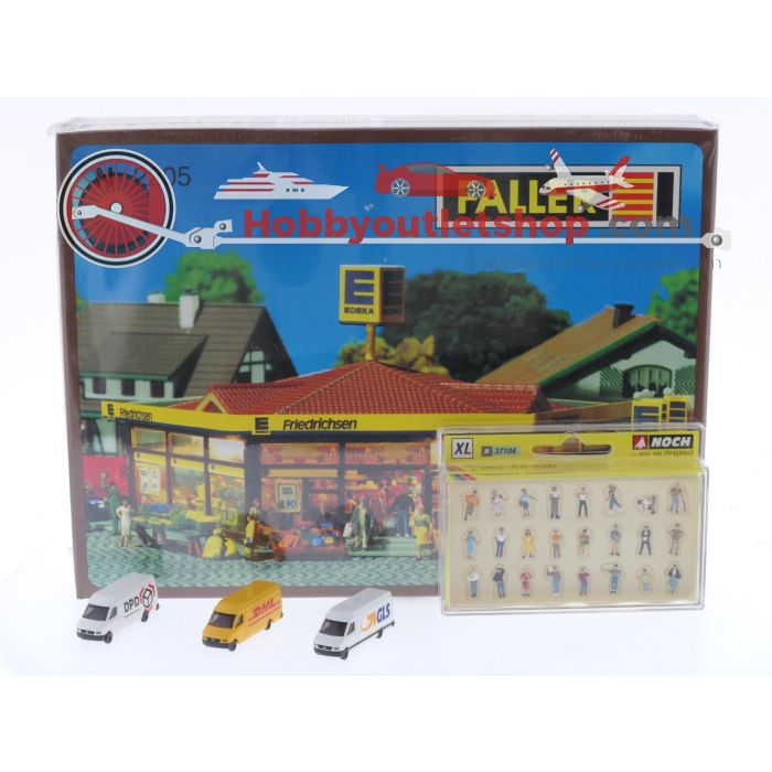 Schaal N Faller 2205 bouwpakket suppermarkt met 37104 voorbijgangers set XL en 3 bestelbussen #5521