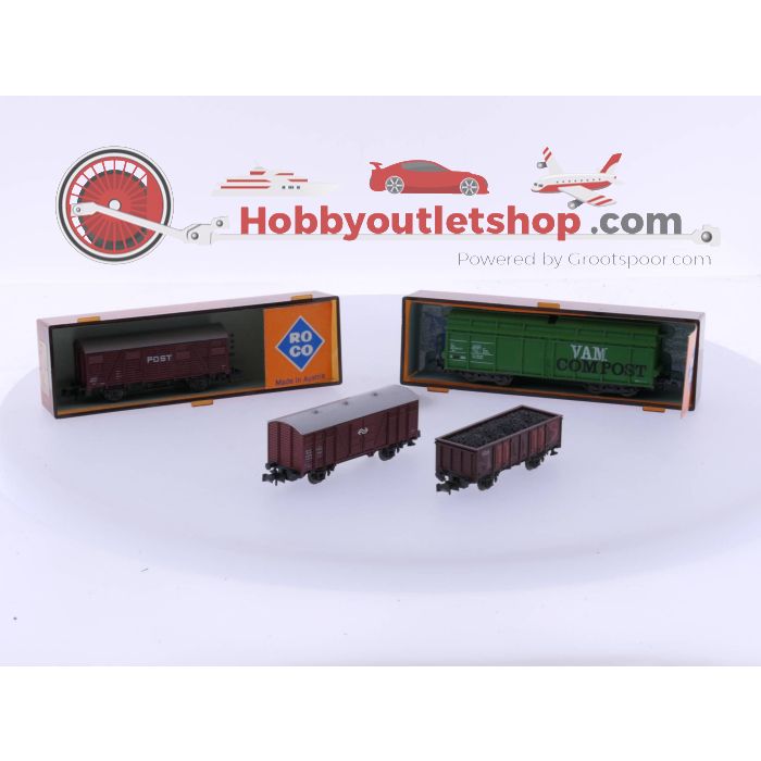 Schaal N Roco 2306S Gesloten wagen, Roco 2317B Open wagen, Roco 2325B open wagen en Roco 2366B Zelflosser "VAM" van de NS #4758