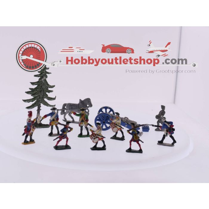 8 geverfde tinnen soldaatjes, 1 ongeverfd (kogeldrager) compleet geverfd kanon en boom en een ongeverfd paard #3688