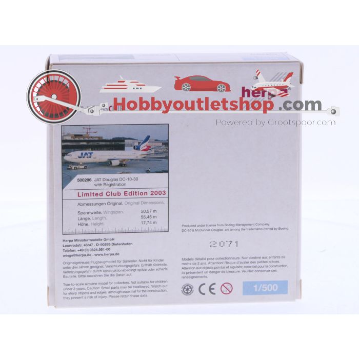Schaal 1:500 Herpa 500296 JAT Yugoslav Airlines Douglas DC-10-30 Reg. YU-AMB #7106