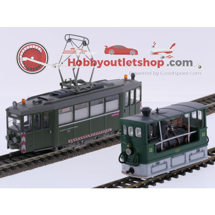 Dieses H0 Set umfasst zwei unterschiedliche Straßenbahnmodelle: eine Dampfstraßenbahn von Atlas mit der Artikelnummer 7519002 sowie einen elektrischen Motorwagen von Kato mit der Artikelnummer 30931. Der Motorwagen trägt die Beschriftung Vestische Straßenbahnen mit der Betriebsnummer 230.