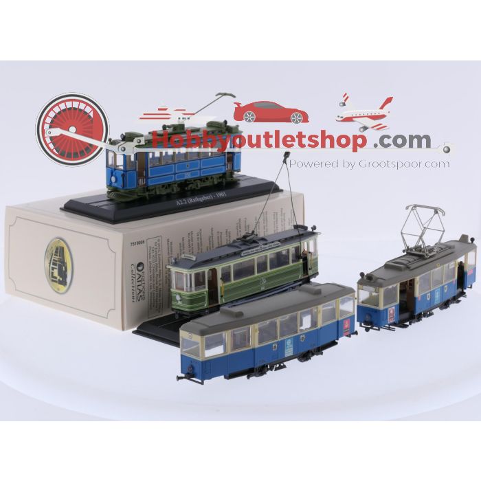 Dieses H0 Straßenbahn-Set von Atlas aus der Stängl & Salber Sammlung besteht aus drei Modellen in Münchner Ausführung. Enthalten sind eine A2.2 (Rathgeber) Straßenbahn von 1901 sowie ein Zeppelinwagen (MAN/SSW) von 1909, beide auf Display-Sockeln mit Beschriftung montiert. Zusätzlich ist ein blauer Triebwagen mit der Betriebsnummer 749 enthalten, ausgestattet mit einem montierten Pantographen.