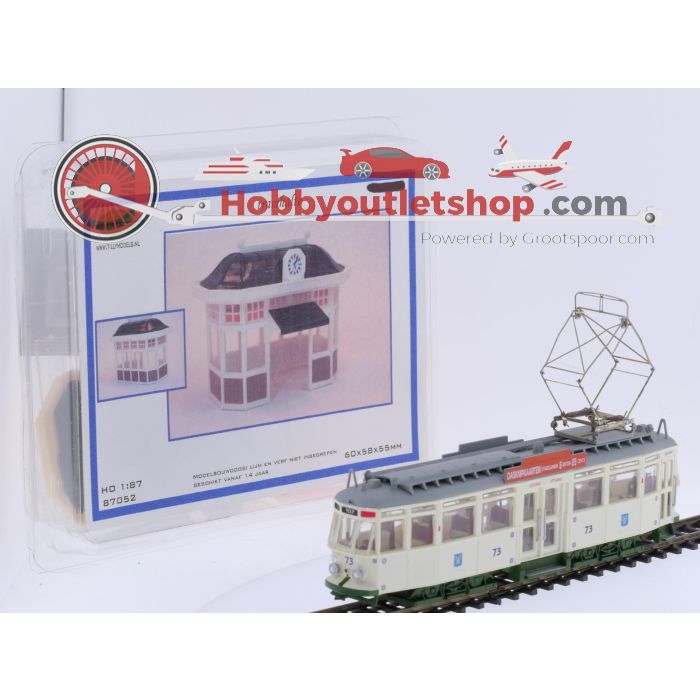 Im Lieferumfang enthalten ist ein Bausatz einer Straßenbahnhaltestelle Arnhem von Tilly Models (Artikelnummer 87052). Die Haltestelle ist größtenteils vormontiert und besteht aus mehreren Einzelteilen wie transparenten Fenstern und Dachelementen. Die charakteristische Wartehalle mit Uhr ist gut erkennbar und teilweise mit farbigen Fenstern ausgestattet.