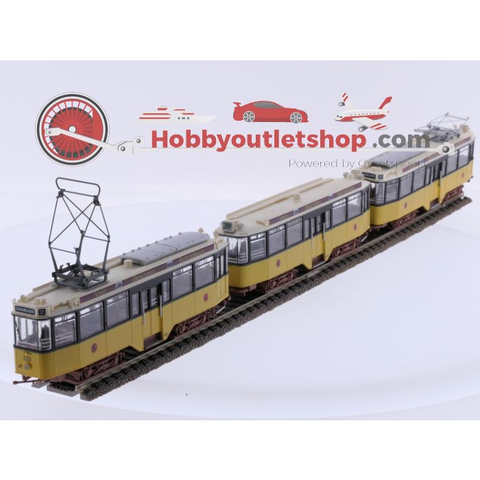Dieses H0-Modell von Atlas stellt eine Straßenbahn der RET Rotterdam mit der Betriebsnummer 520 dar. Das Set besteht aus drei Teilen: zwei Triebwagen und ein zu einem Beiwagen umgebautes Fahrzeug. Die Farbgebung ist in Gelb/Creme ausgeführt mit Beschriftungen wie „Rotterdam“ und dem Werbeband „Visit Beautiful Rotterdam“. Auf dem Dach befinden sich Pantographen, die von der Standardausführung abweichen. Die Fronten zeigen die Liniennummer 2 sowie das Ziel Charlois. Durch die Fenster ist der Innenraum mit Sitzplätzen sichtbar. Fahrwerke und Drehgestelle sind einfach ausgeführt. Lieferung ohne Originalverpackung, geeignet für Sammlung oder Anlagenbetrieb.