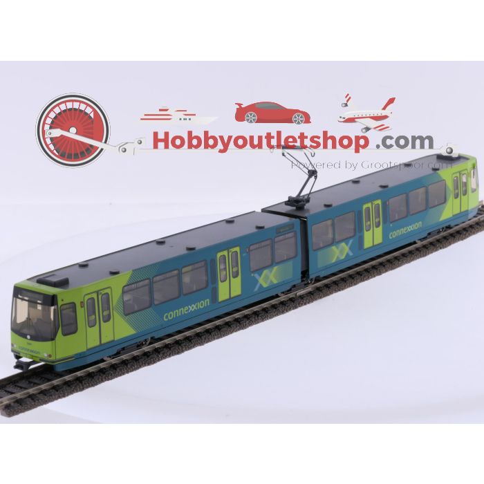 Das Modell besteht aus zwei Teilen mit beweglichem Gelenk und verfügt über einen Dachpantographen. Die typische Connexxion Farbgebung in Blau und Grün mit Beschriftungen ist sauber umgesetzt. Durch die Fenster ist der Innenraum sichtbar, was zur realistischen Darstellung beiträgt.