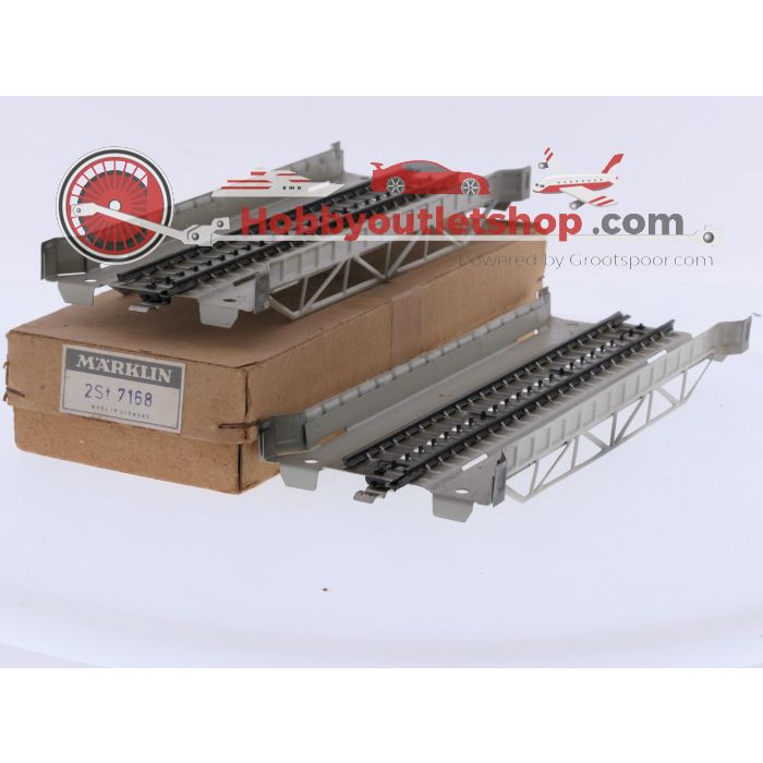 Die Lieferung erfolgt in der originalen Märklin Verpackung mit der Kennzeichnung „2St 7168 – Made in Germany“ sowie mit originalem Verpackungspapier. Die Rampen zeigen sichtbare Gebrauchsspuren wie leichte Verschmutzungen und altersbedingte Abnutzung.