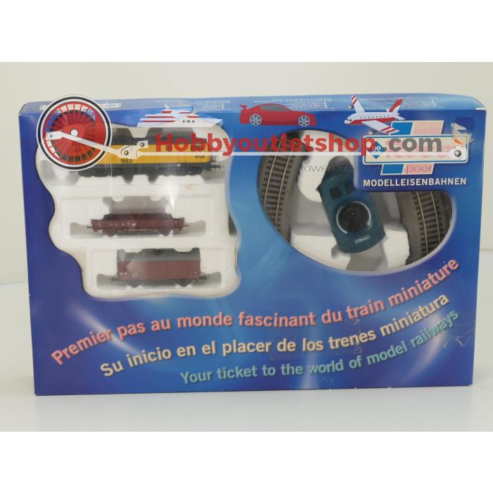 Dieses Startset von Roco (41128) in Spur H0 enthält eine Elektrolokomotive der NS Baureihe 1900 mit der Betriebsnummer 1983. Die Lok ist in gelber NS-Lackierung ausgeführt und wird mit zwei Güterwagen geliefert: einem Flachwagen und einem gedeckten Wagen. Zusätzlich sind mehrere Gleisstücke enthalten, darunter gebogene und gerade Elemente, sowie ein Roco Transformator und Fahrregler für den analogen Betrieb. Das Modell ist digital vorbereitet mit einer 8-poligen Schnittstelle. Der Flachwagen hat keine Kupplungen und der gedeckte Wagen weist sichtbare Beschädigungen auf. Die Originalverpackung ist vorhanden und zeigt Gebrauchsspuren.