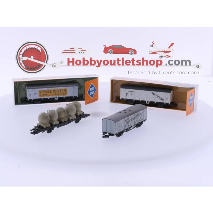 Schaal N Roco 2307 Koelwagen "Pschorr Bräu", Roco 2307 Koelwagen Seefische, Roco 2307C Bierwagen "Paulaner" en een Roco Bollenwagen van de DB#4760
